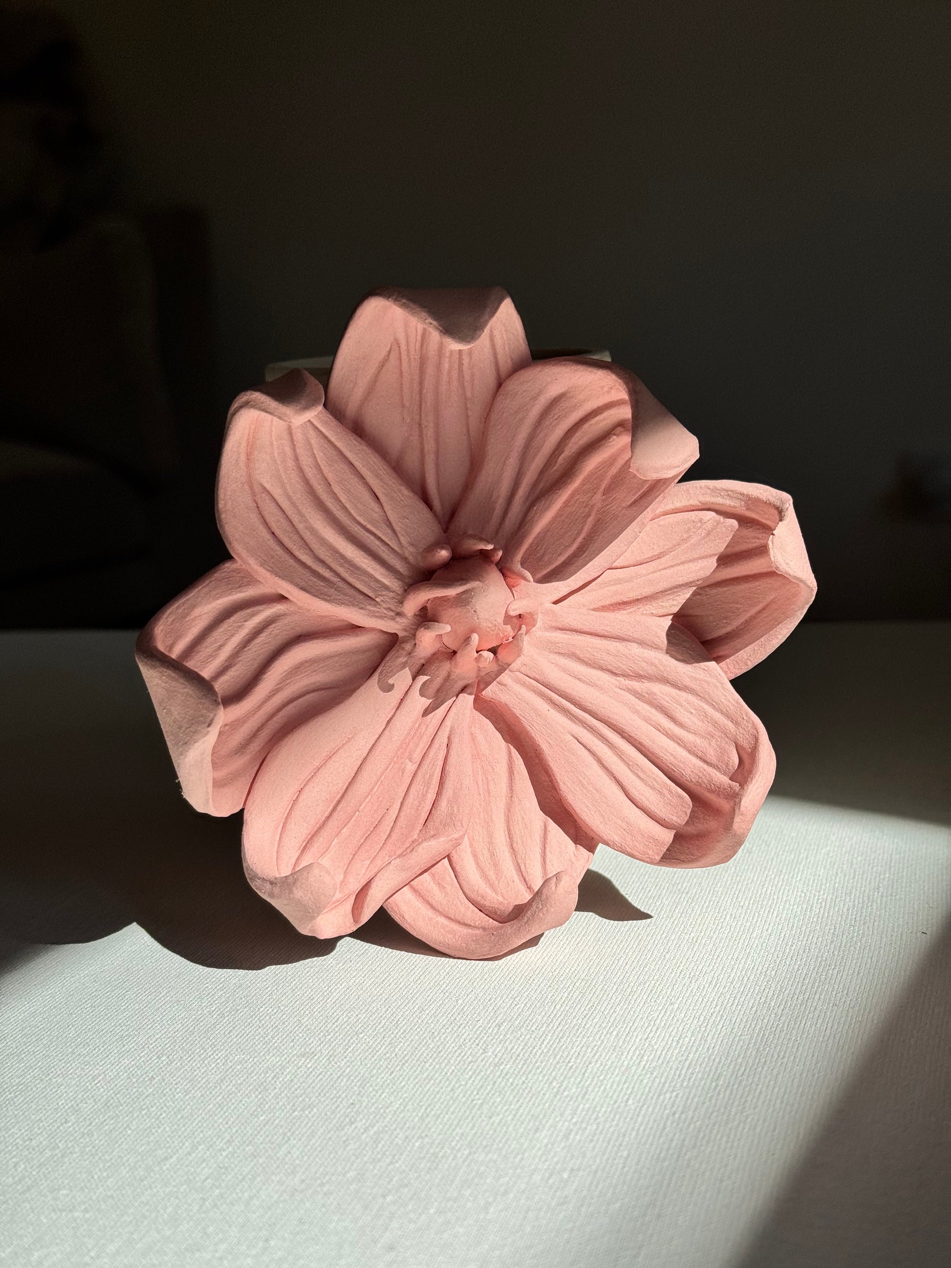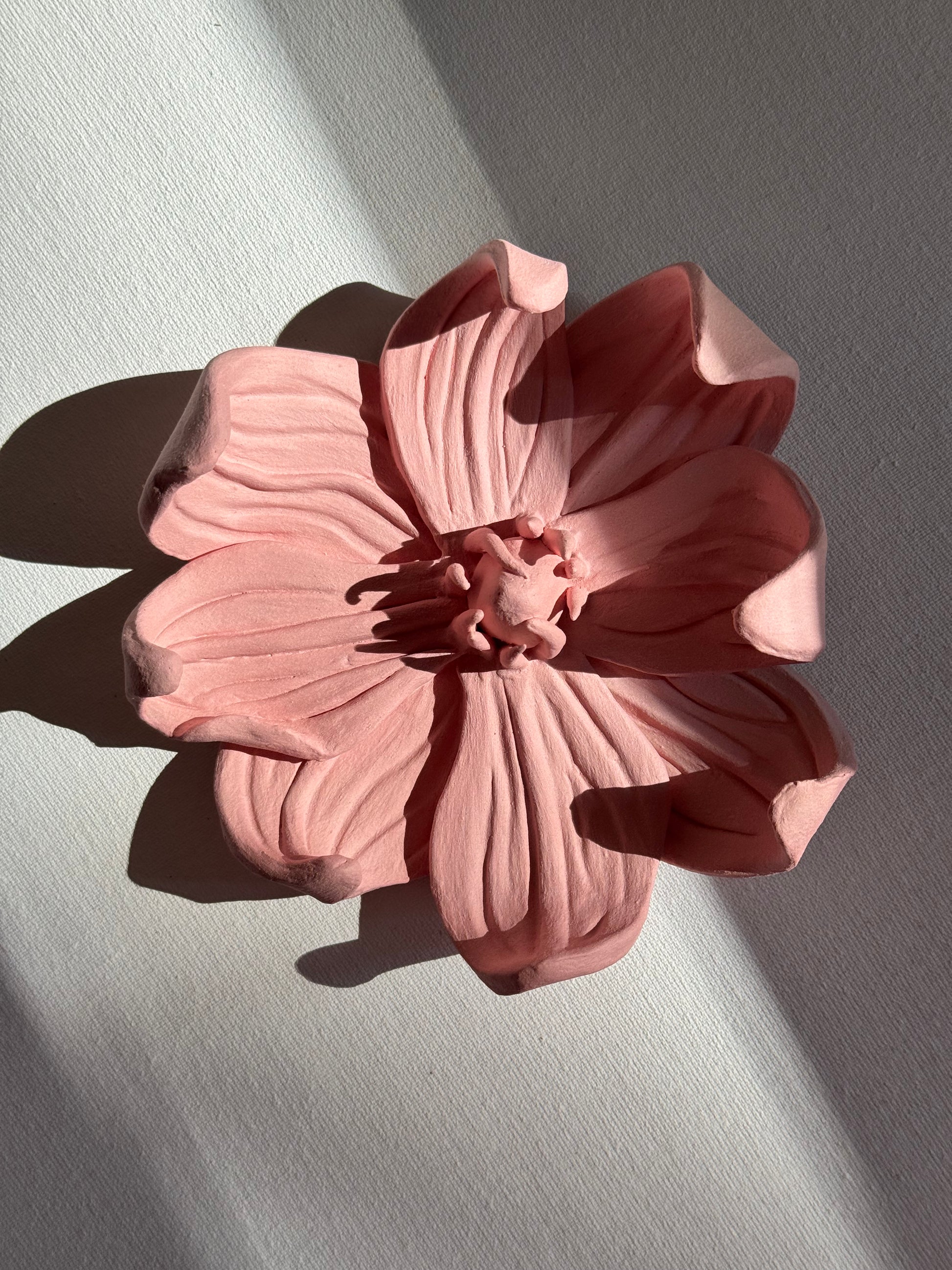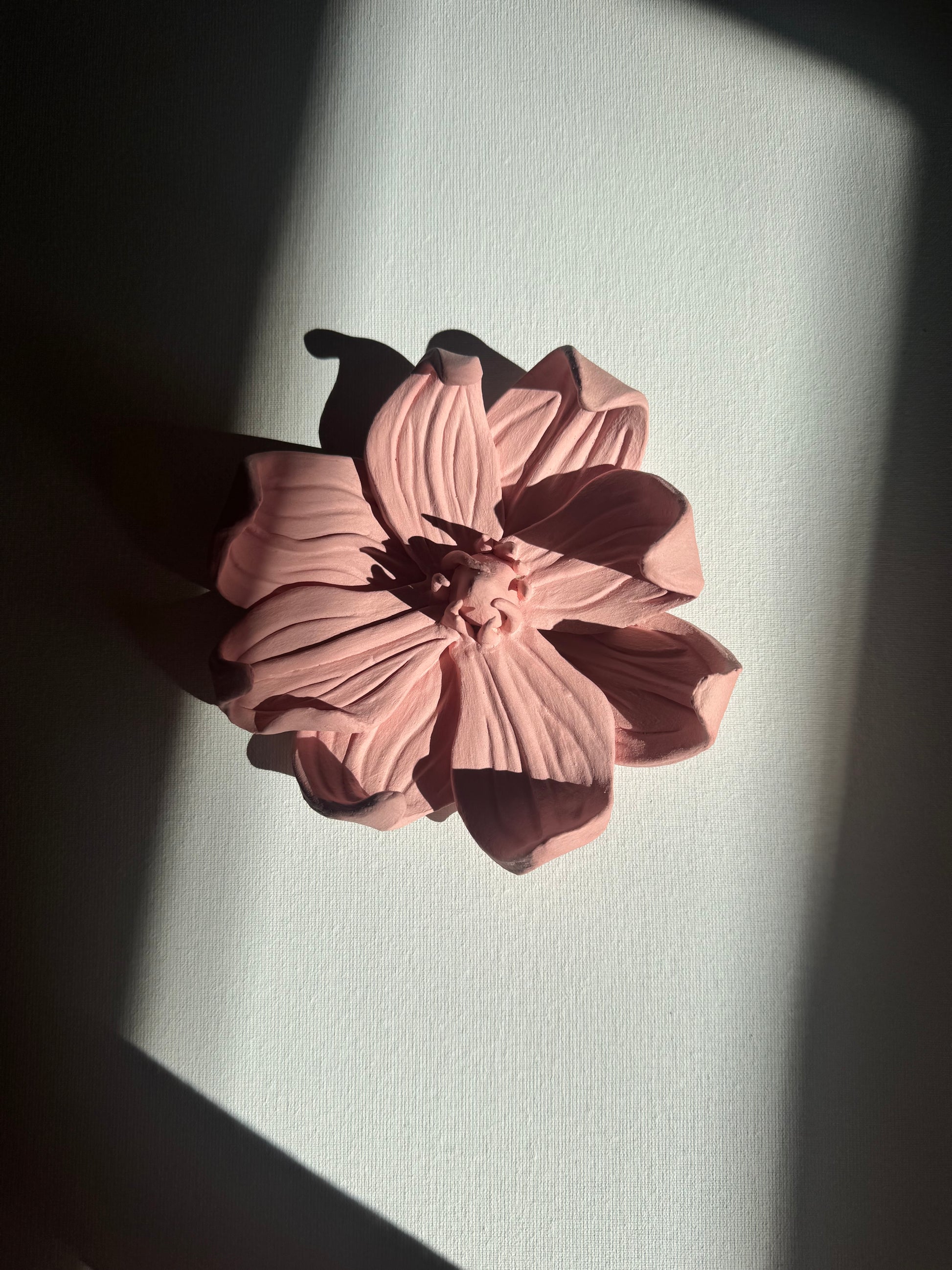 Wykonany z jasnej ceramiki i pokryta delikatnym różowym matowym szkliwem. Kwiaty są wypalane na wysoką temperaturę co sprawię, że są bardzo silne i wytrzymałe. Kwiatki mają również haczyk od tyłu by móc je powiesić na ścianie.