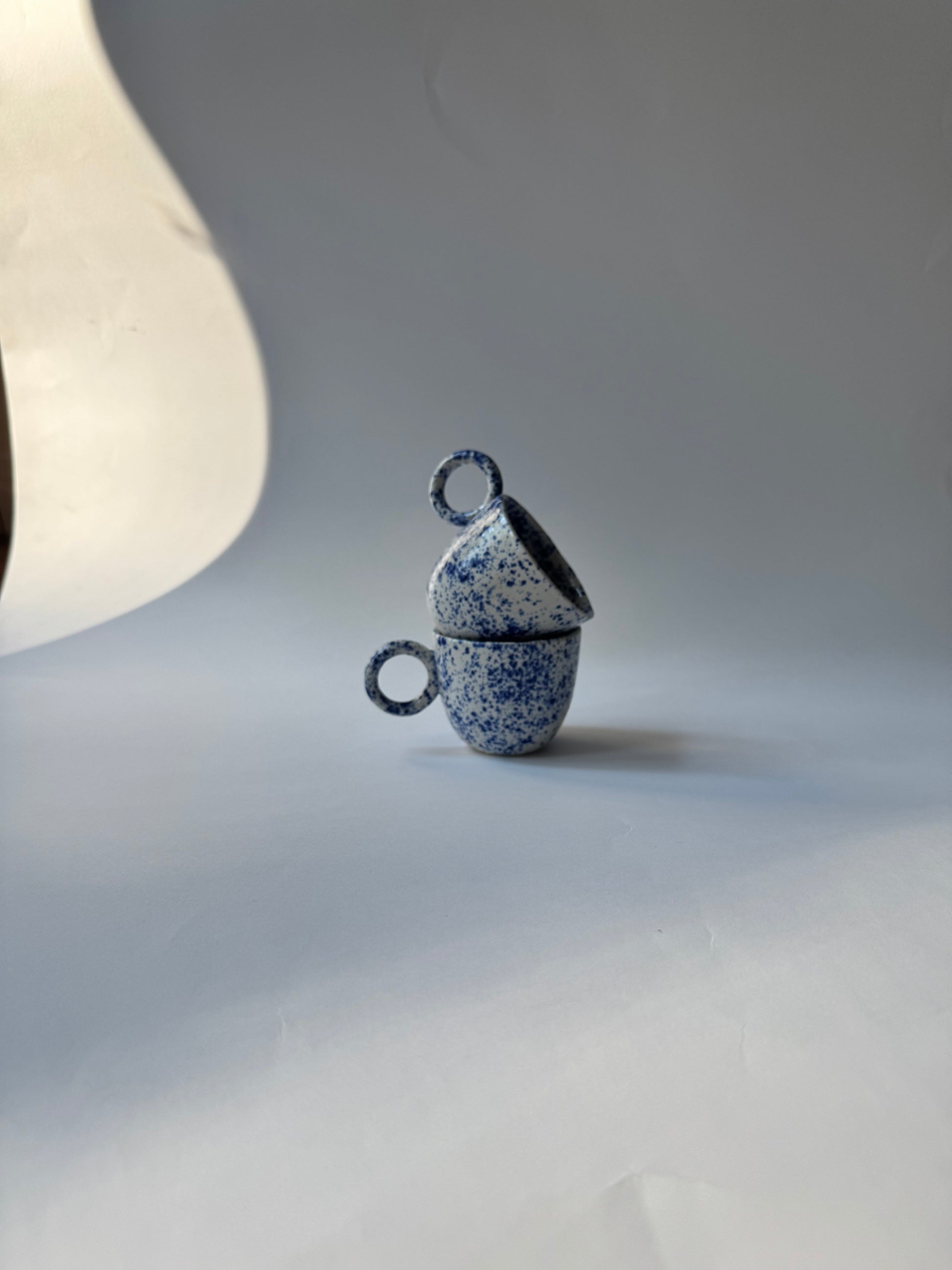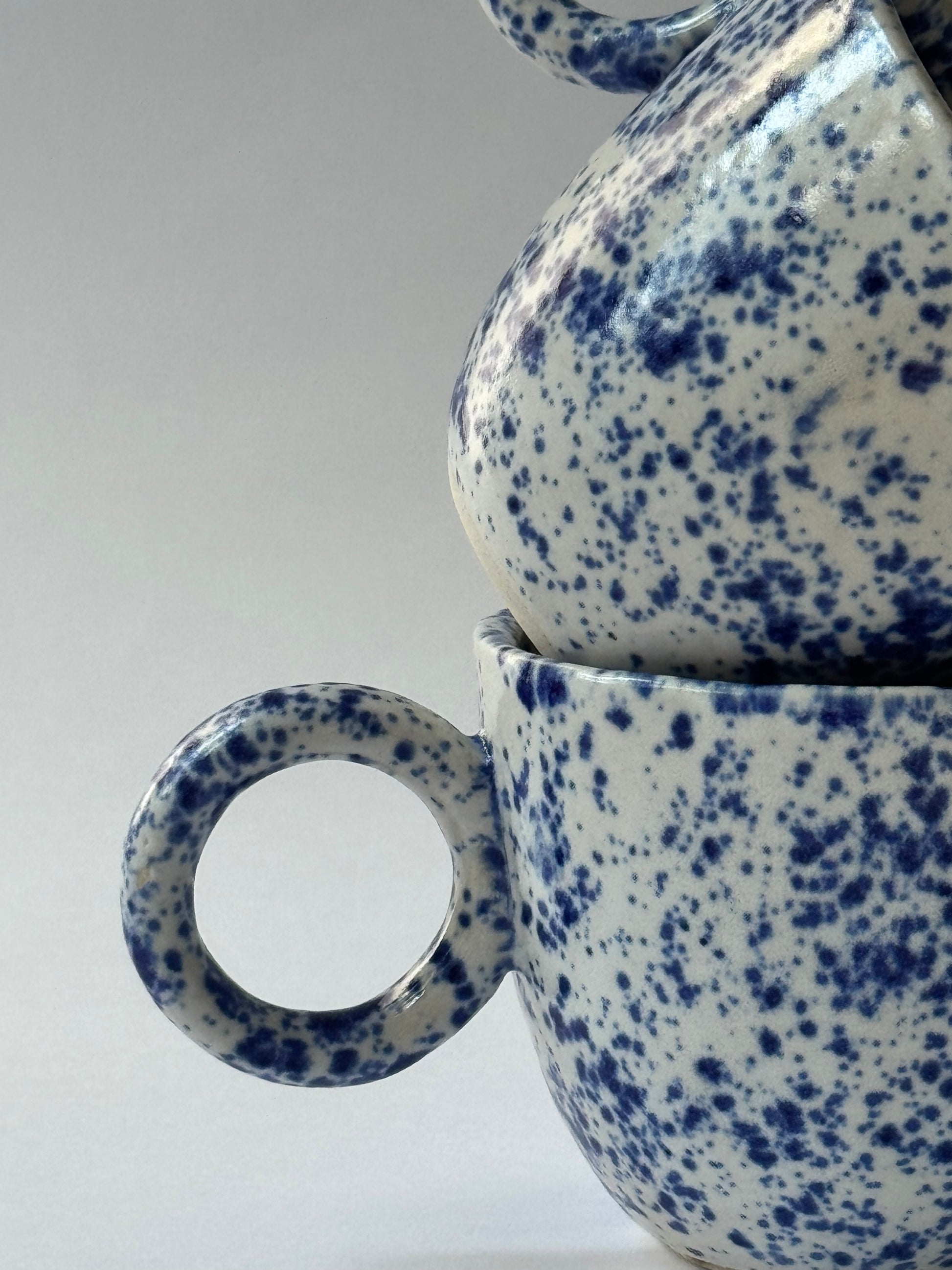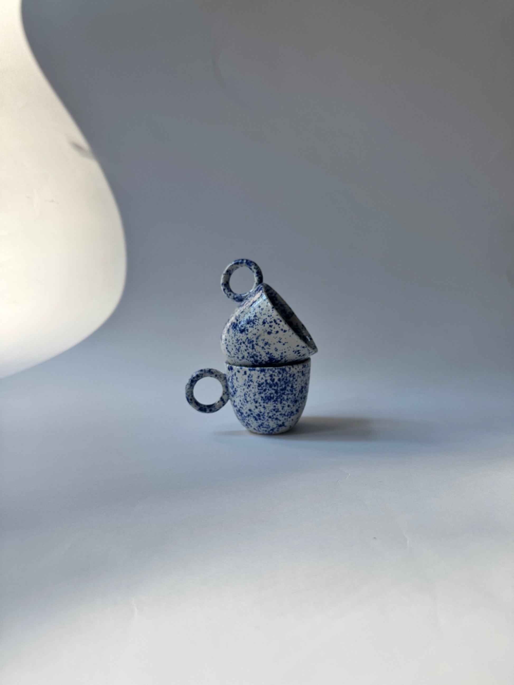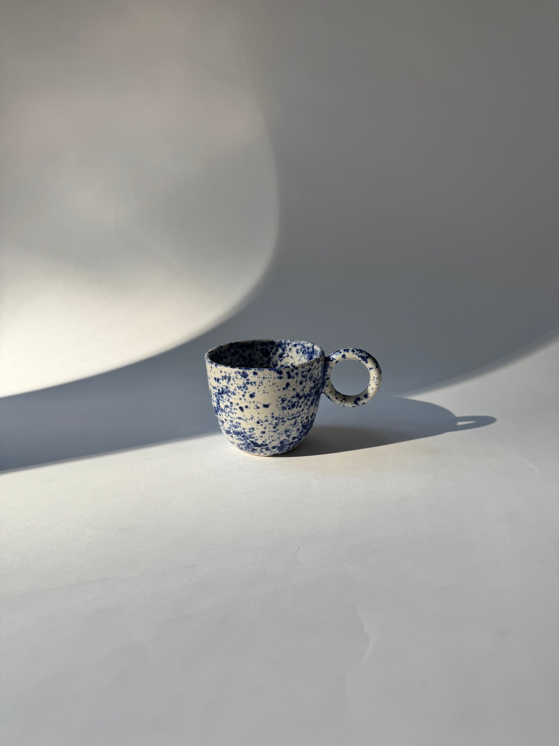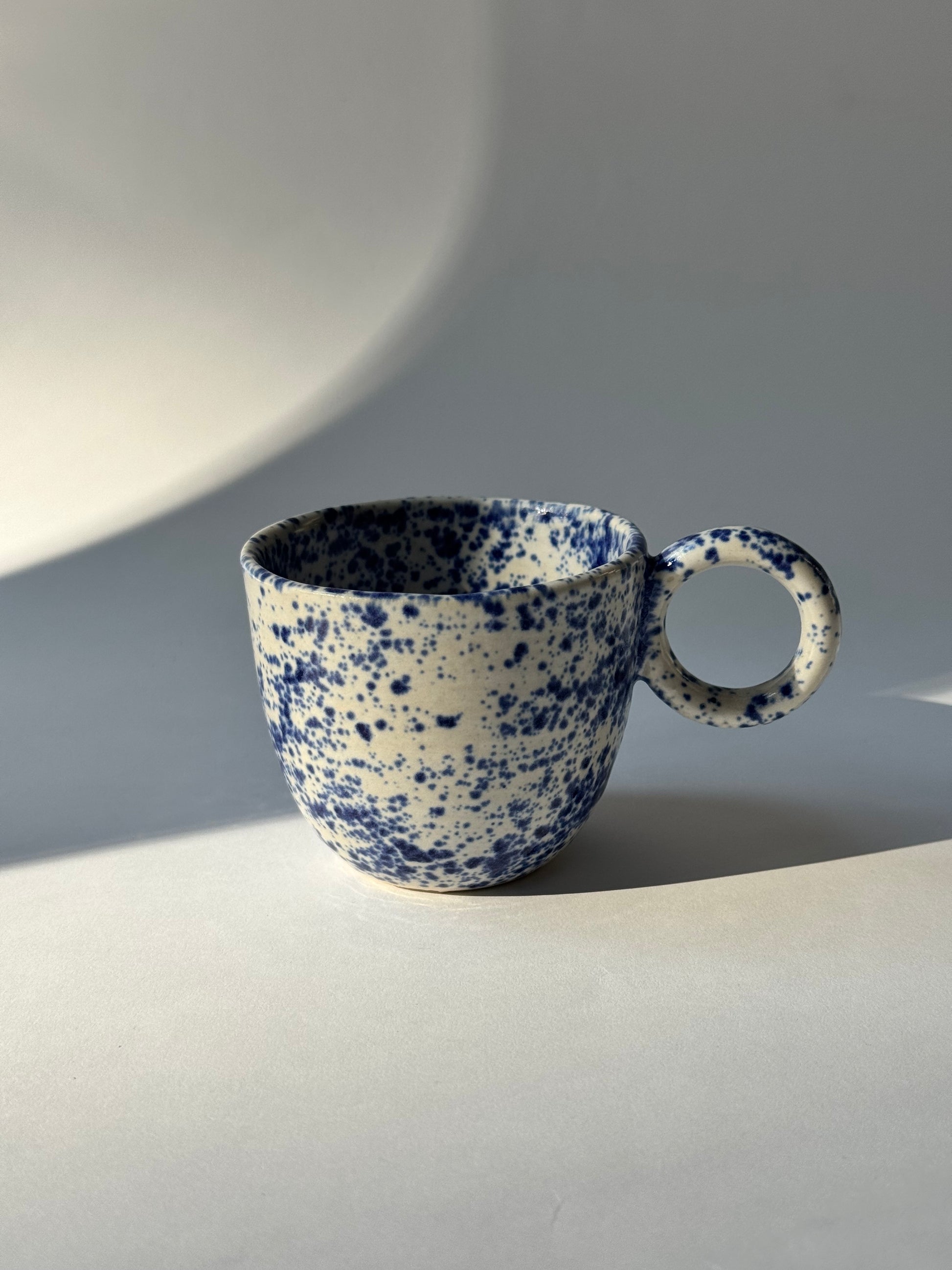 Nakrapiany biało niebieska kubek z okrągłym uchem. Idealny do espresso i większej kawy.