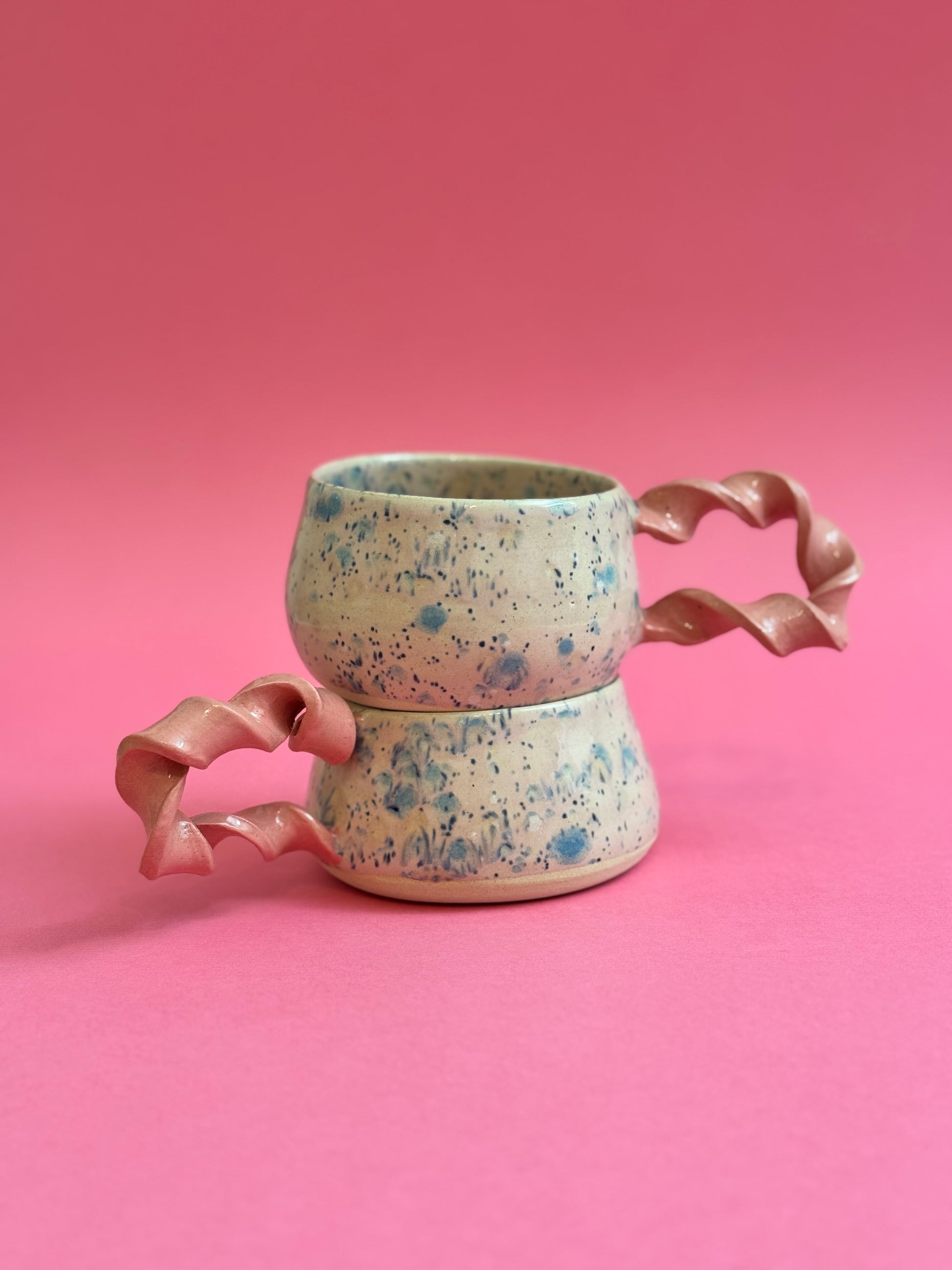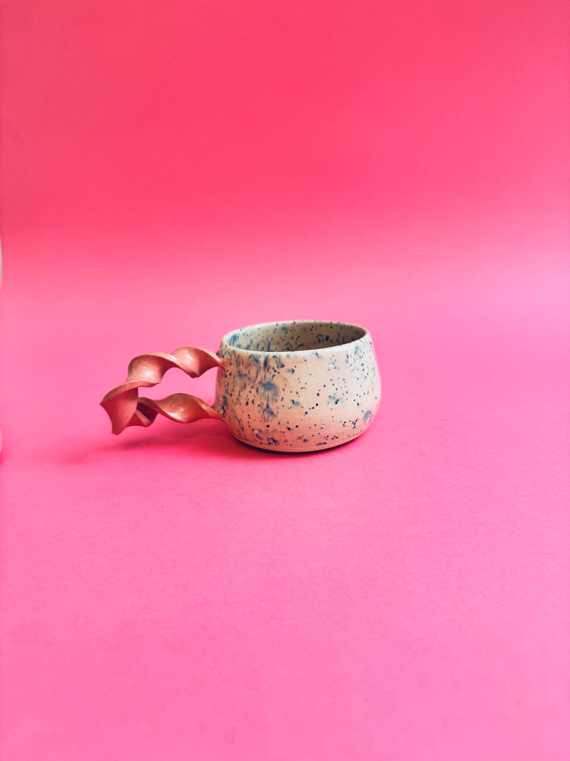 Wykonany z jasnej ceramiki, poszkliwiony różowym szkliwem z niebieskimi drobinkami. Do użytku domowego i użytkowania z żywnością. Można również myć w zmywarce i wsadzać do mikrofalówki.