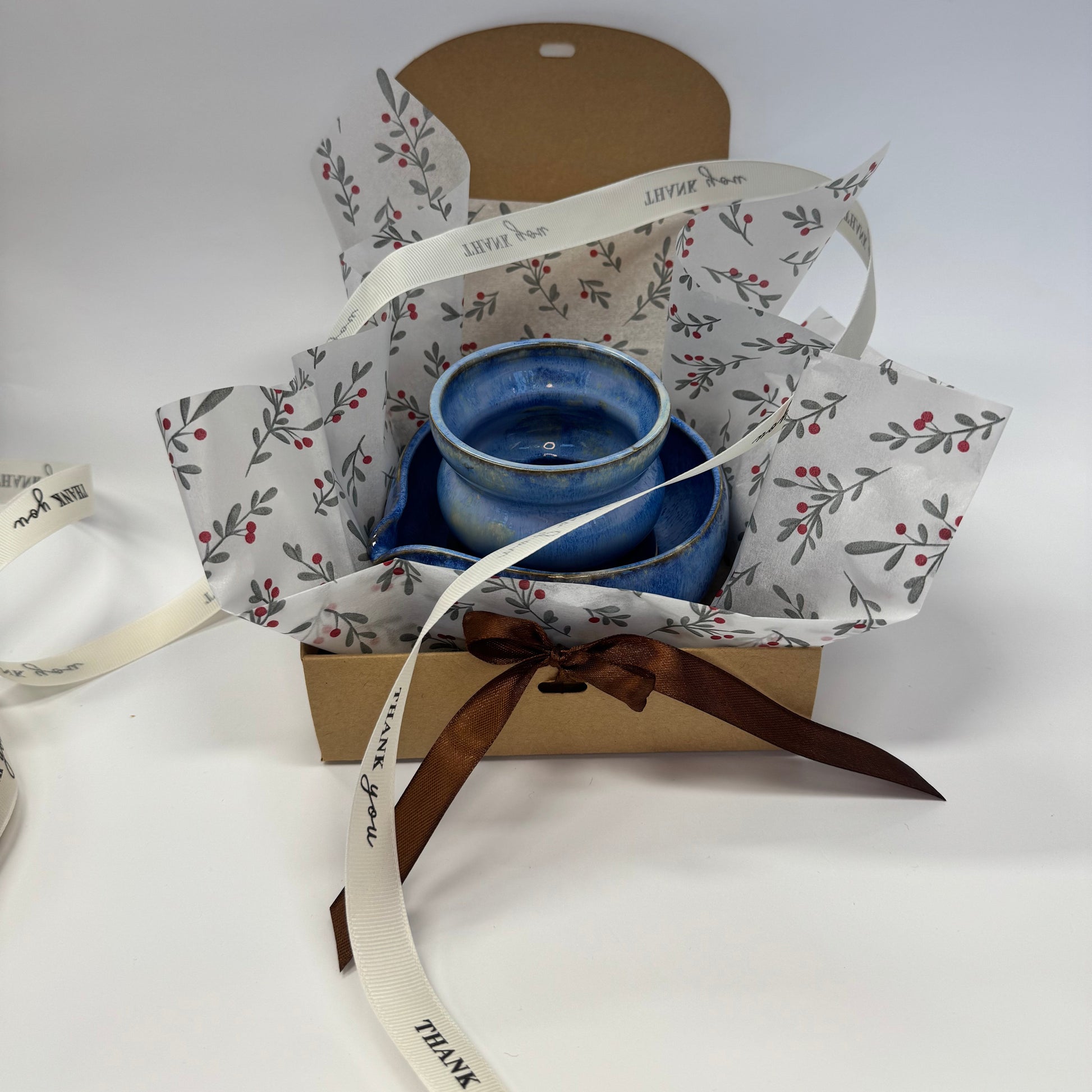 Wykonany z ceramiki jasnej/ beżowej, pokryta pięknym niebieskim szkliwem. Do użytku domowego i użytkowania z żywnością. Można również myć w zmywarce i wsadzać do mikrofalówki.