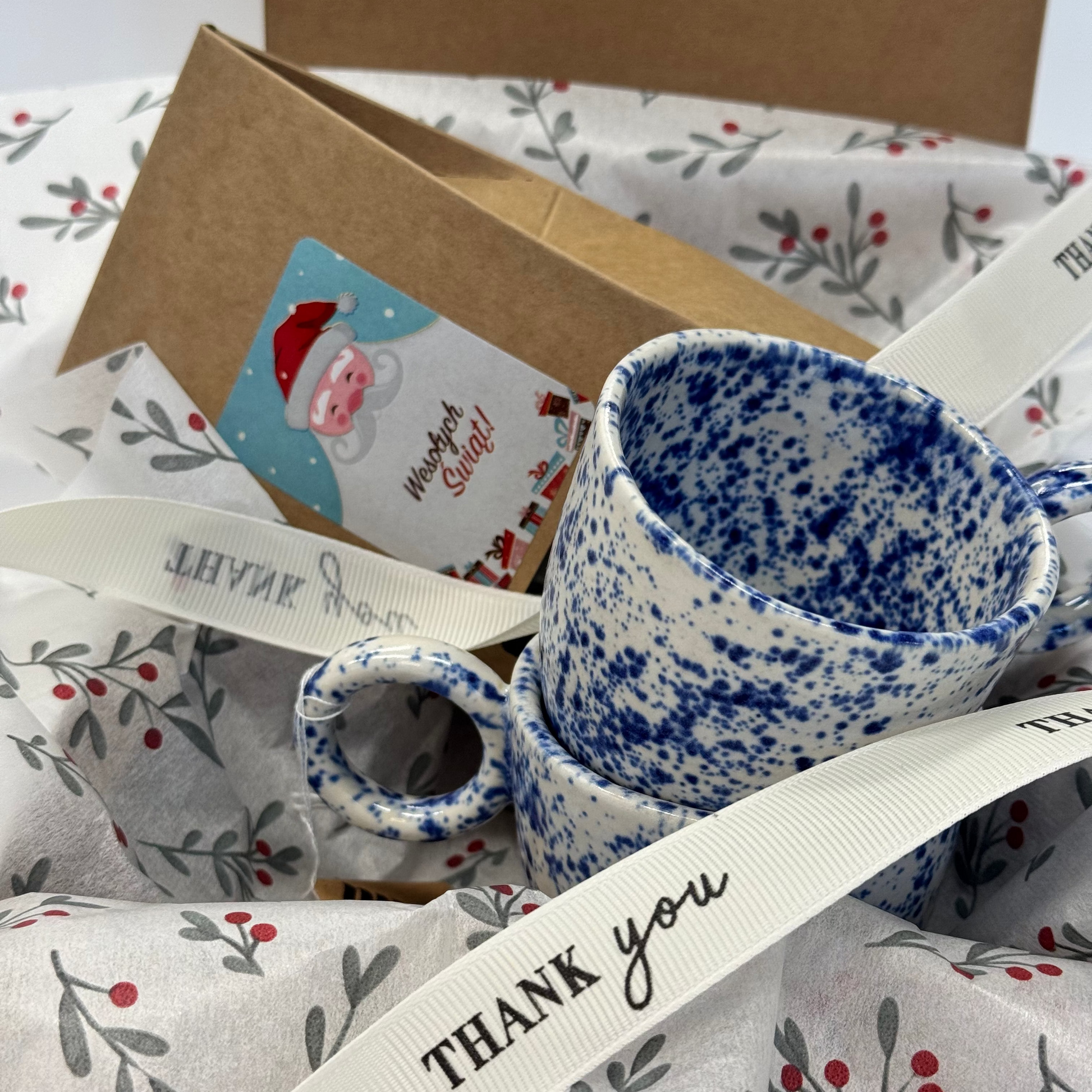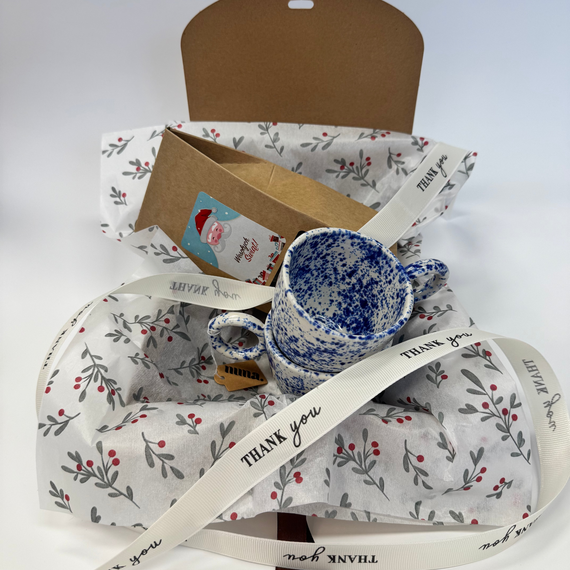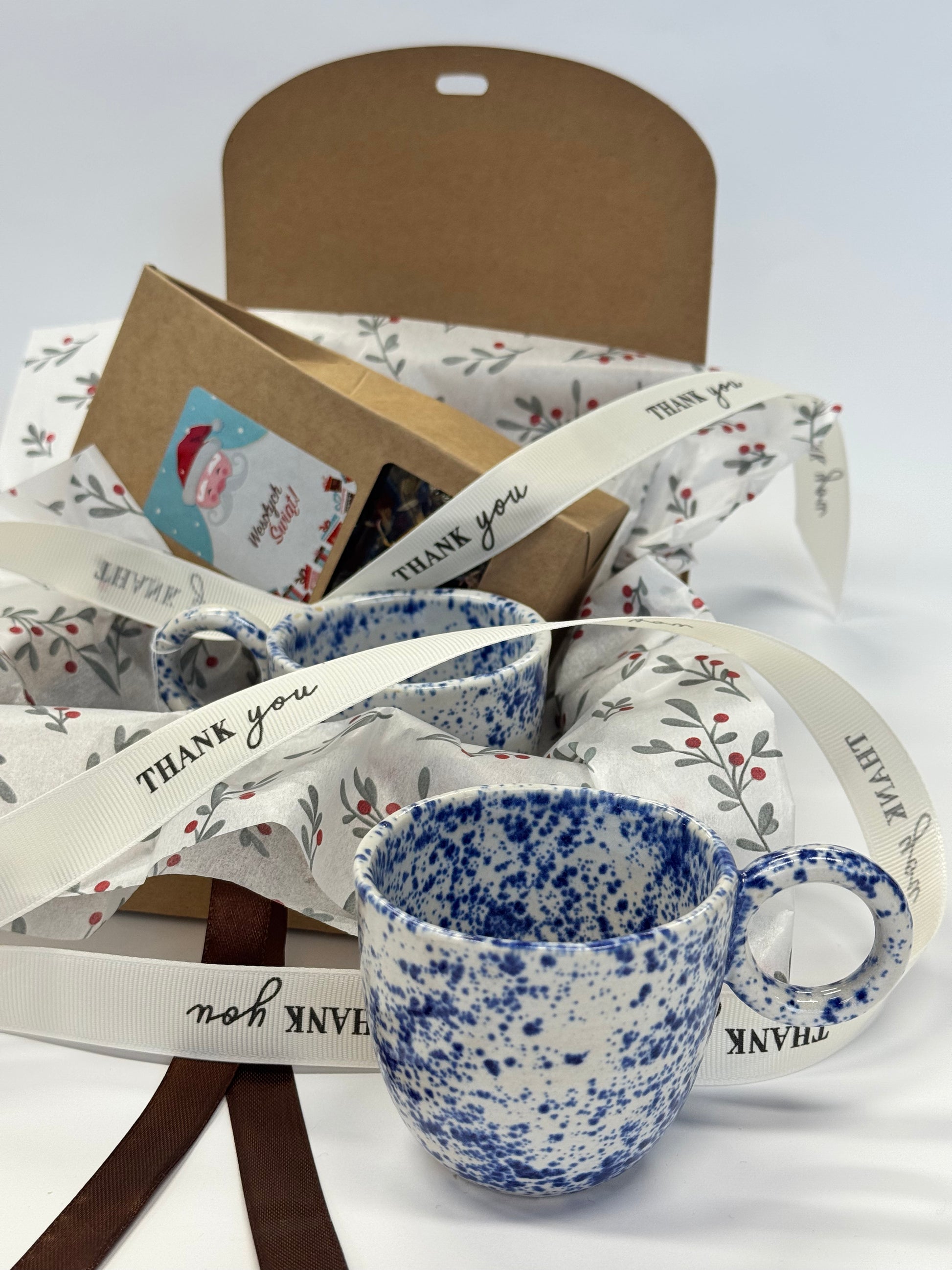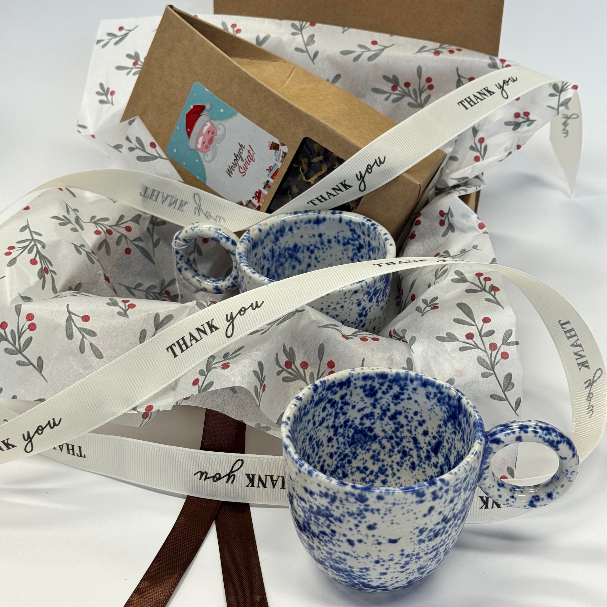 Zestaw prezentowy z dwoma niebieskimi pieguskami. W zestawie jest herbata zimowa.