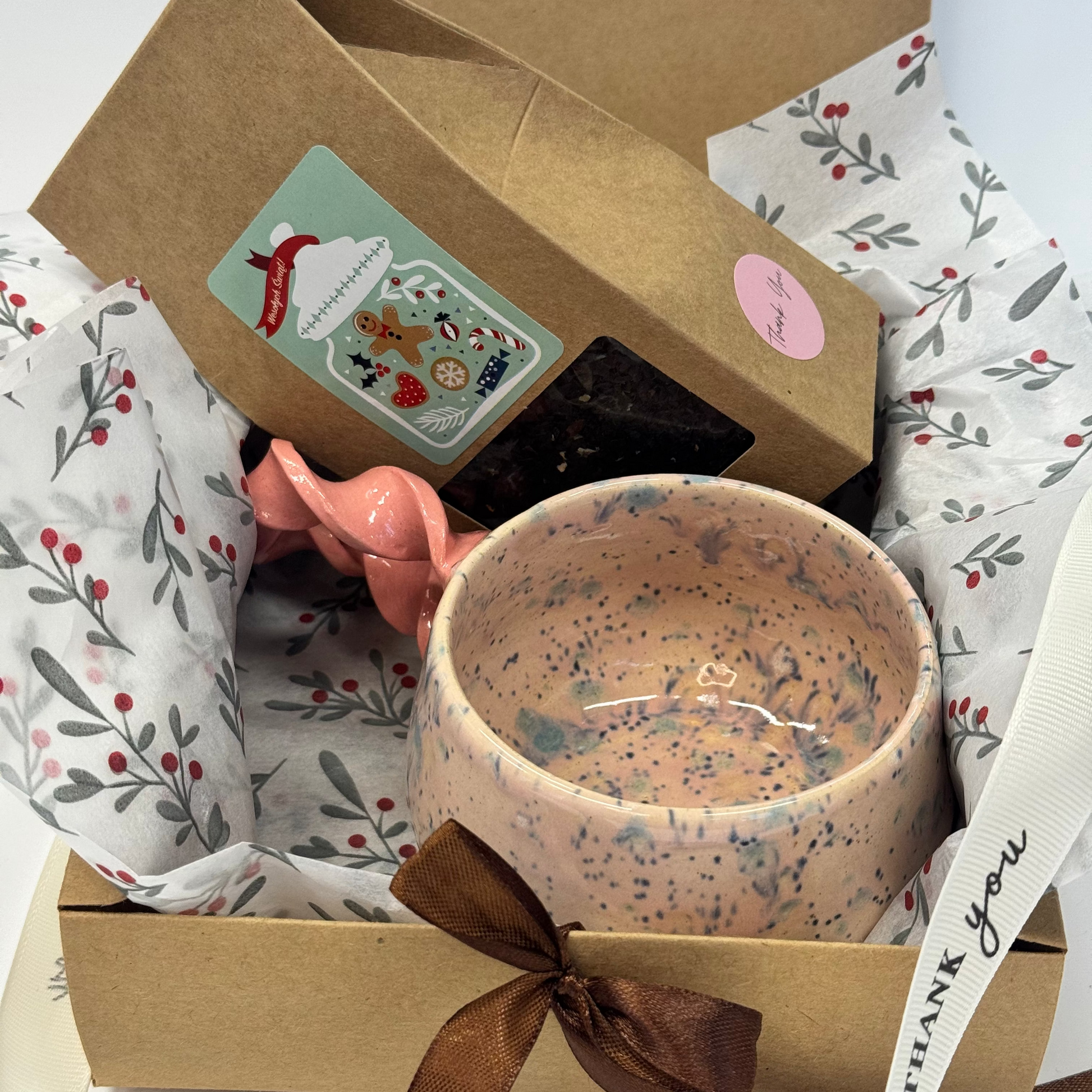 Zestaw prezentowy z zakręconym różowym kubkiem. W zestawie jest herbata zimowa.
