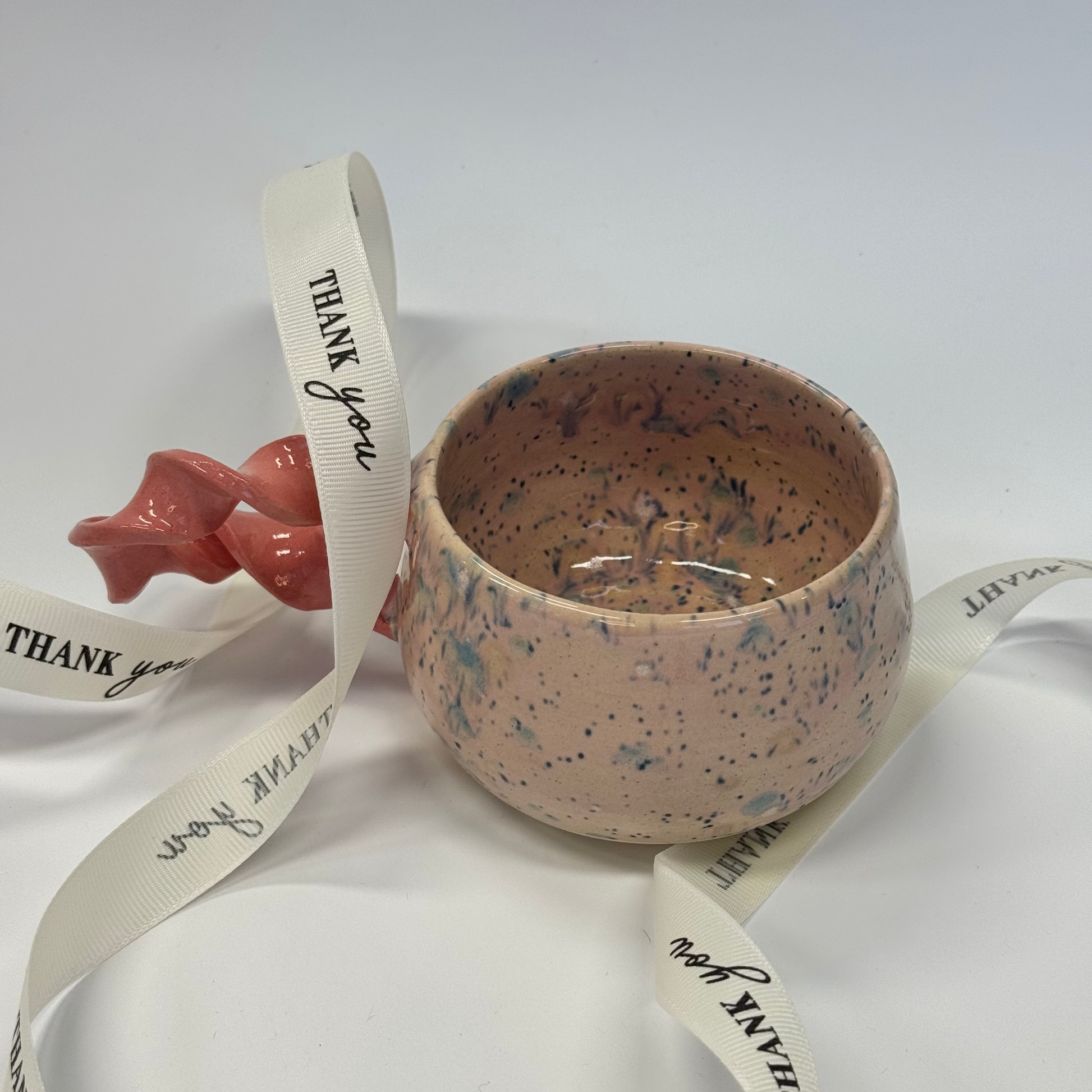 Wykonany z ceramiki jasnej/ beżowej, zakręcony kubek, poszkliwiony różowym kolorem z małymi drobinkami niebieskimi. Do użytku domowego i użytkowania z żywnością. Można również myć w zmywarce i wsadzać do mikrofalówki.